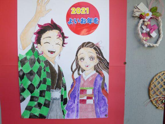 今日は2021仕事始めの日です。先ほど、校区内を回りましたが、児童を公園で数名見ただけでした。今のところ、休み中も児童が事故に遭ったとか事件に巻き込まれたとか言うような情報はありません。6日には、元気な顔で登校していただきたいと思っています。今年もよろしくお願します。写真の作品は全て職員が作成してくれたもので、外掲示板、玄関に掲示しています。