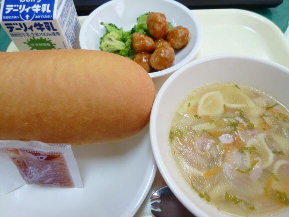 ジャム、コッペパン、ミネストラスープ、ミートボールのケチャップ煮、ブロッコリー