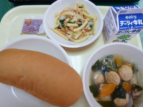 今日のメニューは「コッペパン、肉団子のスープ、マカロニサラダ、苺ミックスジャム」