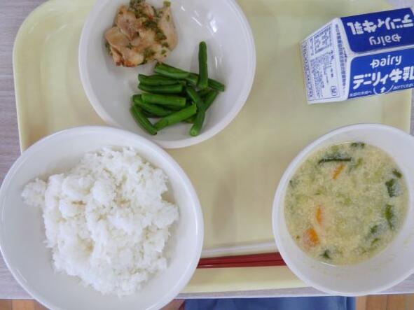 日南産新米、中華コーンスープ、鶏肉のピリ辛焼き、インゲン