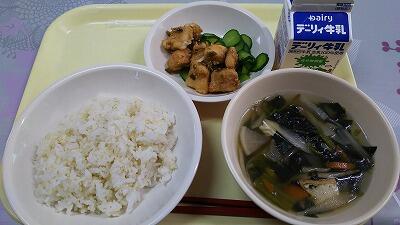 麦ごはん、五目豆腐スープ、鶏肉のレモン煮、きゅうり