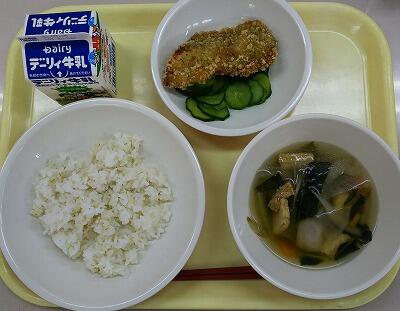 麦ごはん、ABCスープ、白身魚ののり塩揚げ、きゅうり、お祝いゼリー