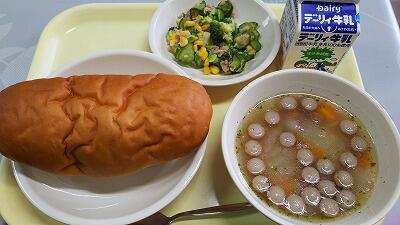 コッペパン、肉団子スープ、じゃがいもとベーコンのソテー、イチゴジャム