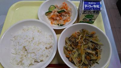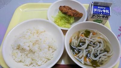 麦ごはん、魚うどんのすまし汁、れんこんきんぴら、しそ味ひじき