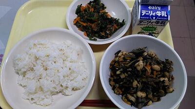 麦ごはん、五目豆、ほうれん草の磯香和え、ぽんかん