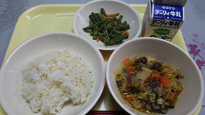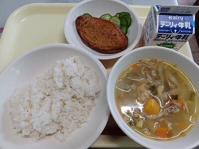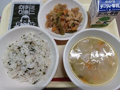 まる麦ごはん、じゃがいものすいとん、かつおの角煮、給食のり