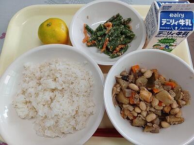 麦ごはん、けんちん汁、いわしの生姜煮、いんげん、福豆