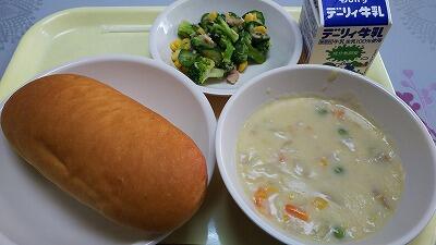 コッペパン、クリームシチュー、ブロッコリーサラダ