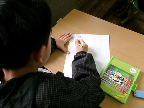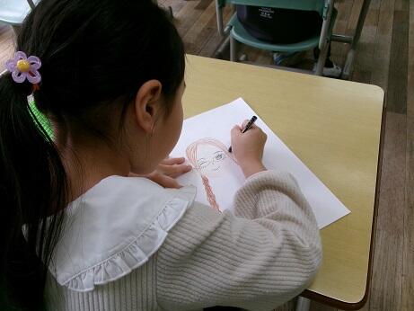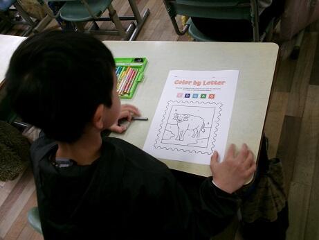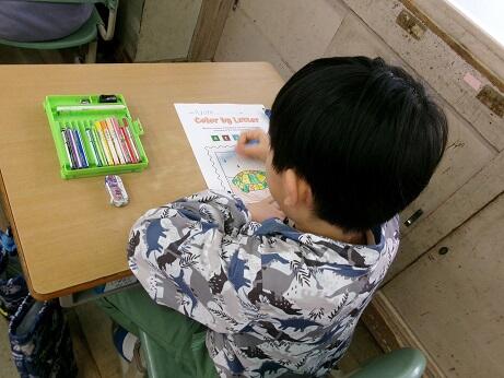 好きな食べ物や英語でのじゃんけんの仕方などを教えてもらっていました。そして、色塗りをしていました。