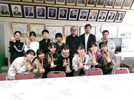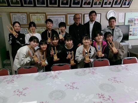 3月12日(水)には、日南飫肥杉デザイン会の3名の方が来校され、吾田小合唱部の6年生11名に全国大会最優秀賞受賞記念トロフィーを手渡していただきました。合唱部全員の45名分の記念トロフィーを寄贈していただきました。