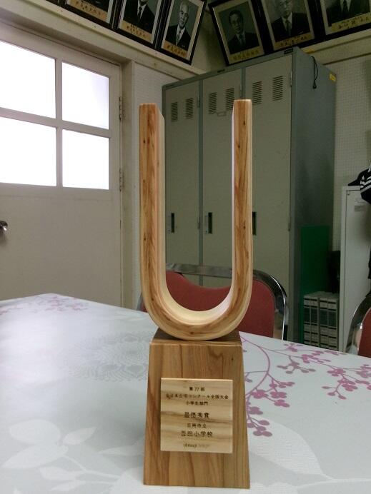 飫肥杉で造られるかつお漁船製造に使われる「曲げ工法」を利用した「音叉」型の飫肥杉製記念トロフィーです。