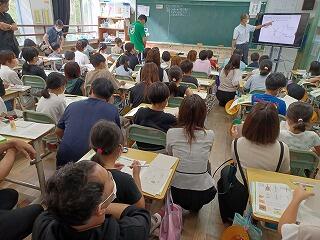 今日は、1・2年生の参観日でした。1年生の保護者の皆さんにとっては、初めてお子さんの授業の様子をご覧いただける機会でした。いかがだったでしょうか。4月から2ヶ月の間に、できるようになったことがたくさんできた子ども達です。国語の授業でしたが、リズムに合わせて小さい「つ」のつく言葉を元気よく読んでいました。2年生は、あるものをペアで、一人が言葉で説明し、もう一人がタブレットで絵に表す学習でした。とても楽しそうでした。どちらの学年も、お家の人が見ているといつも以上に真剣に学習に望む姿が印象的でした。
