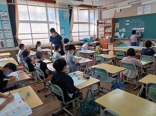 今日は、2年生と5年生の子ども達の学習の様子をお伝えします。2年3組さんは、算数の単元テストを静かに受けていました。立腰の姿勢もしっかり出来ていて、きっとみんなよい点が取れていることでしょう。2年1組さんは、算数の「たしかめよう」(復習)をしていました。次の時間は、テストかな?!2年2組さんは、音楽室で曲に合わせて身体表現をしていました。「大きな花が咲きました~!」とても楽しそうでした。5年1組さんは、算数の「体積」のプリントしていました。担任と算数少人数の先生の2人が子ども達の質問に応えながら、学習を進めていました。5年2組さんは、理科で「種子の発芽」の学習をしていました。種子を半分に切って、ヨウ素液をかけると濃い青紫に反応することを観察していました。ゴールデンウィーク明けでしたが、みんな真剣に生き生きと学習に取り組んでいました。