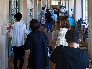 年度初めの身体計測の最後は1年生です。廊下に無言で整列して、順番を待っています。立派です。始めに視力検査を行い、身長と体重を計測しました。今後、聴力検査や内科検診などの定期検診も行っていきます。