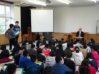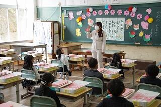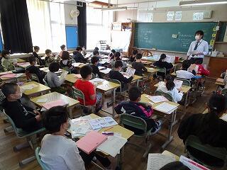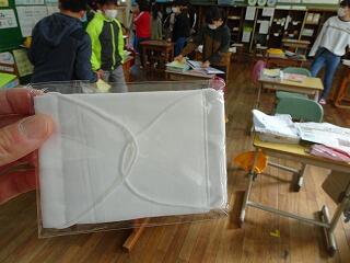 1時間程度で学級での指導は終わり、最後に文科省からの布マスクを子どもたちに一枚ずつ配布。