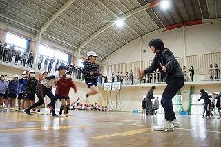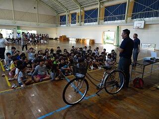 体育館で、自転車事故事例や点検方法、安全な乗り方を学びました。