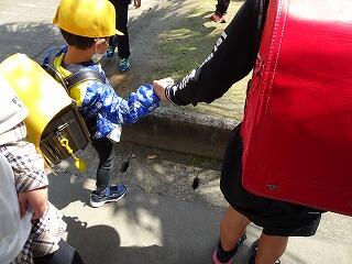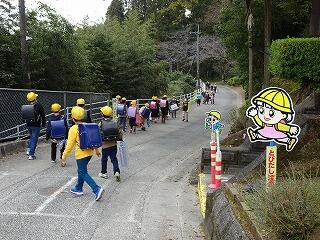 ボランティアの皆様の協力を得て、みんなと一緒に集団下校。