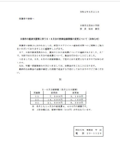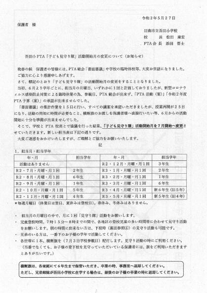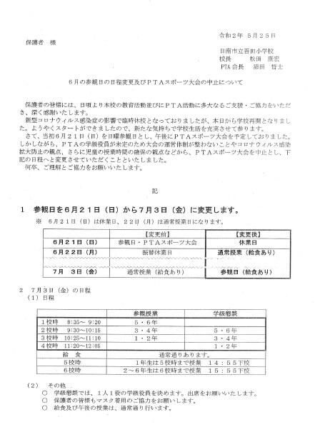 6月の参観日の日程変更及びPTAスポーツ大会の中止について