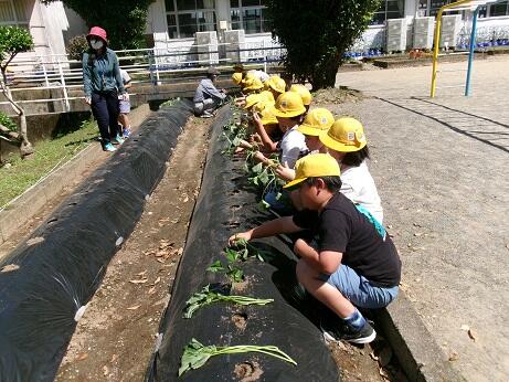6月4日(火)には、2年生が生活科でイモの苗植えを行いました。「紅まさり」という品種のようです。