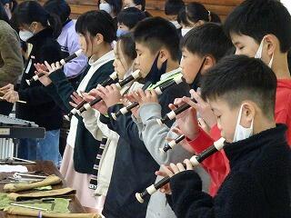 ②学年の児童全員で発表会を目指して演奏する中で、表現の技能を高めると共に、音の重なりや響きの美しさ、音楽の楽しさを味あわせる。