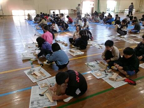 まずは、木工教室です。飫肥杉のペン立てを製作しました。釘を金槌で打つ体験を行いました。