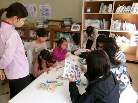 3つに分かれて、毛糸の編みもの作りをしたり、竹を使ったおもちゃ作りをしたり、おじゃみ作りをしたりしていました。