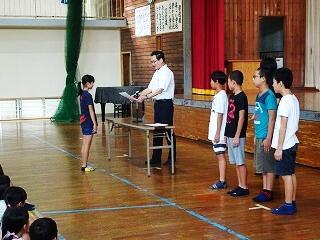 校長先生や生徒指導の先生のお話の後、愛鳥週間の習字「金賞」や水泳大会「入賞」等の表彰を行い、日南ラビッツバレーボールクラブ主将から「全国大会準優勝」の報告もあり、明るい話題でいっぱいでした。