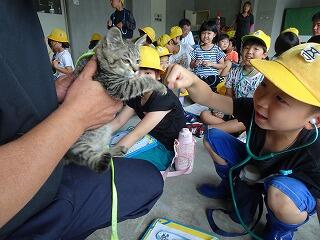 動物とのふれあい体験では、犬、猫に聴診器を当て鼓動を確認し、私たちと同じ命がある事を実感。