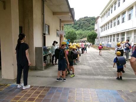 各教室での帰りの会の後、放送で時間を分けて各地区ごとに移動を呼びかけ、中庭に集合し、集団下校を行いました。