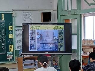 今日は、6年生の総合的な学習の時間に、県南地区で活動されている退職教職員協議会の中武さん、福田さん、隈本さんを講師に招き、平和についてお話をしていただきました。今なお戦闘が続いているウクライナのことから、戦争は遠い昔、遠いところで起こっていることではなく、身近な日南でも悲惨な戦争が起こっていたことを教えていっただきました。昭和20年、戦争真っ只中の日本、そして、日南でも多くの方が命を落とされたこと、南郷では人間魚雷の訓練が行われていたこと等を教えてくださいました。子ども達は、日々の食べものも無い、厳しい生活を送った経験を聴いて、改めて今の平和のありがたさを実感しているようでした。11月には、修学旅行で知覧を訪れます。それまでに、さらに、平和や命の大切さについて学習を重ねていきます。