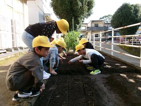 11月12日(火)には、2年生が生活科で冬野菜の種まきをしました。大根・ラディッシュ・かぶ・ほうれん草です。
