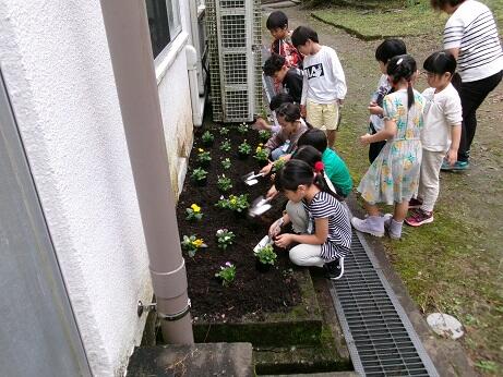パンジーやビオラの苗を学級園に植え替えました。日照時間が少なく、苗も少し小さかったようです。