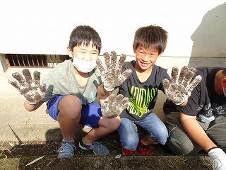 軍手をつけて学級花壇の手入れを行い、軍手が土で汚れたあと、片方は、手洗い洗濯。もう片方は洗濯機を使った洗濯を行いました。