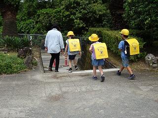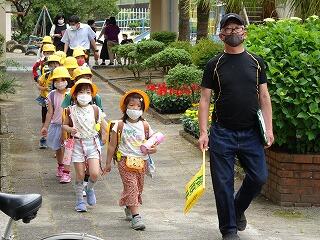 ボランティアの皆様の協力を得て、みんなと一緒に集団下校。