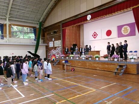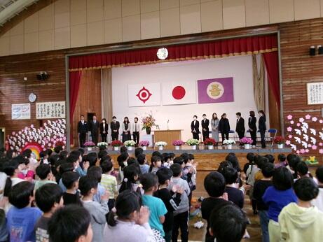 先生方一人一人にあいさつをいただきました。児童代表歓迎の言葉と全校児童による歓迎の歌の発表がありました。