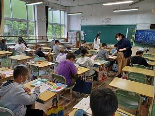 今日は、2年生と5年生の子ども達の学習の様子をお伝えします。2年3組さんは、算数の単元テストを静かに受けていました。立腰の姿勢もしっかり出来ていて、きっとみんなよい点が取れていることでしょう。2年1組さんは、算数の「たしかめよう」(復習)をしていました。次の時間は、テストかな?!2年2組さんは、音楽室で曲に合わせて身体表現をしていました。「大きな花が咲きました~!」とても楽しそうでした。5年1組さんは、算数の「体積」のプリントしていました。担任と算数少人数の先生の2人が子ども達の質問に応えながら、学習を進めていました。5年2組さんは、理科で「種子の発芽」の学習をしていました。種子を半分に切って、ヨウ素液をかけると濃い青紫に反応することを観察していました。ゴールデンウィーク明けでしたが、みんな真剣に生き生きと学習に取り組んでいました。
