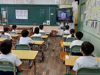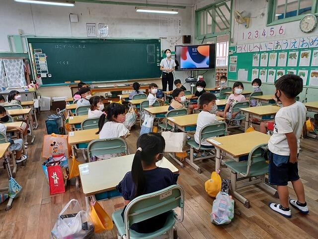 1学期が無事に終了しました。今回もオンラインで終業式を行いました。始めに代表児童が1学期に頑張ったことを発表しました。あいさつや靴並べなど、「当たり前のことを当たり前に」できるように頑張ったことを堂々と発表しました。その頑張りは、学校全体に波及していました。校長からは、日本人なら忘れてはいけない、原爆の日や終戦記念日の話から、一人一人の命を大切にすることや平和の尊さについて話をしました。その後、生活面や学習面、健康面について担当の教員から話をしました。コロナ、熱中症、交通事故、水難事故、不審者対応等、自分の身は自分でしっかり守れるように、ご家庭でもご指導よろしくお願いします。最後に、善行児童への感謝状授与を行いました。詳細については、学校便りをご覧ください。終業式の後、1年生の教室では、子ども達が初めての通知表を担任からもらっていました。しっかりした態度にびっくりしました。