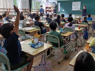 4年生の総合的な学習の時間に、日南保健所の永野さん、日南市役所市民生活科自治課の瀬田さんなど、たくさんの方々のご協力のもと水辺環境調査を行いました。身近な酒谷川の水質や生息している生き物を調べました。においや透明度など五感をフルに使って、川の水を調べました。その後、川底の石をひっくり返して、生き物調べをしました。小さなカニやエビを捕まえて大喜びの子ども達でした。ただ、もうすぐ夏休みです。子ども達だけでは絶対に川遊びをしたり、用水路等に近づいたりしないようにしましょう。