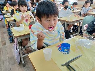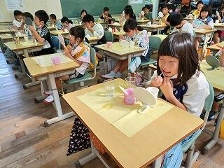 昨日から1年生の給食がスタートしました。2日目は、子ども達の大好きなカレーでした。4時間目が終わると手洗いうがいを済ませて、給食当番が来るのを静かに待つことが出来ていました。お兄さんお姉さんが手際よく配膳をしてくれていました。その後、どのクラスも食器を持って、上手に、おいしそうに食べていました。ちゃんと黙食もできていることに感心しました。感染防止対策はばっちりでした。もりもり食べて大きくなって欲しいと思います。
