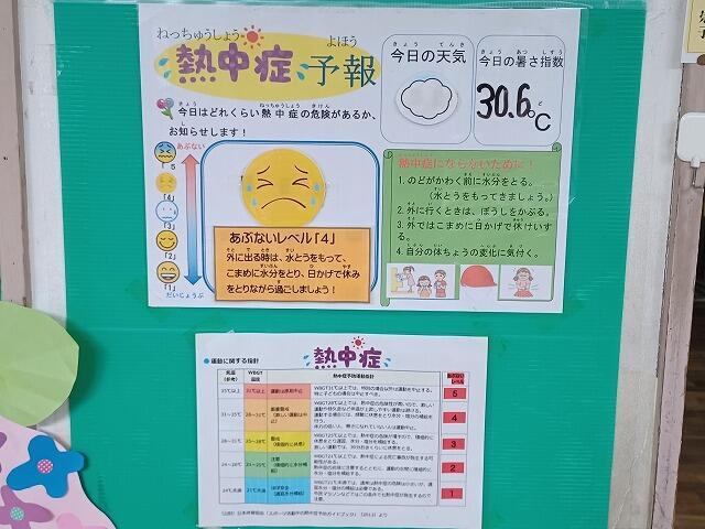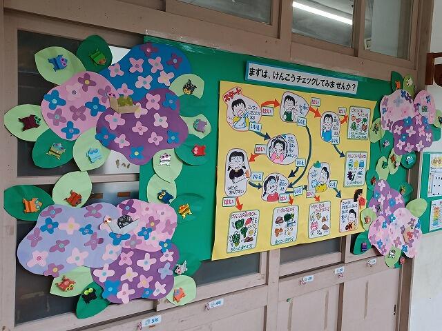 7月に入り、保健室の掲示板がリニューアルしました。涼しげな海中をイメージするような掲示板になりました。かわいいマンボーやたこなどの海の生き物と一緒に、「冷たいものの食べ過ぎに注意!」「あせはすぐにふき取って、いつも清潔な下着をつけていますか?」「外に行くときはぼうしをかぶっていますか?」等のカードが見え隠れしています。子ども達は、のれんのようなスズランテープをめくっては、楽しそうに読んでいました。隣には、クワガタやカブトムシもいます。いつも素敵な掲示板をありがとうございます。