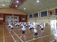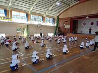 体育館では、1年生が先生のお手本を見て動きをまねしていました。いろいろな動きがあって大きな歓声も上がっていました。動きの切り替えもテキパキとできるようになっていました。