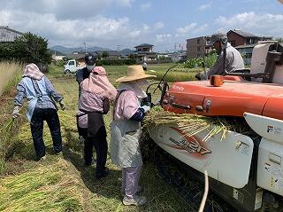 JA職員様とボランティアの皆様に、稲刈りのご説明とお手伝いしていただき、稲刈り開始。
