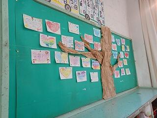 先日の全校朝会でボランティア掲示委員会の提案であった、ハッピーウイークが始まっています。うれしかったことや友だちから優しくしてもらったことなど、ハッピーになったことを掲示板に掲示していく取組です。1年生は、独自に「ありがとうの木」を教室の中に作っていました。「いつもあそんでくれて、ありがとう。」「えんぴつをかしてくれてありがとう。」とハート型の紙に書いていました。やさしい心がどんどん育って、大きな木にたくさんのハートの葉っぱが増えますように・・・。