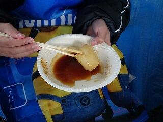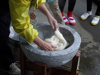 蒸したもち米が入った臼に向かって、重い杵で交互に突くと徐々に餅らしくになっていき、つき終わると今度は餅を小さく取り分け、餅が出来上がりました。