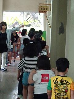 一列に並び、職員室、家庭科室、音楽室など教室を回り、みんな興味津々。