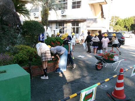 10月26日(木)の朝の活動は、みどりタイムでした。夏の花を抜いて、土作りを行う作業でした。