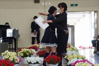 受け取った卒業生は、卒業証書を保護者に渡し、その際、一声掛けたり、抱き合ったりして、心温まるシーンでした。