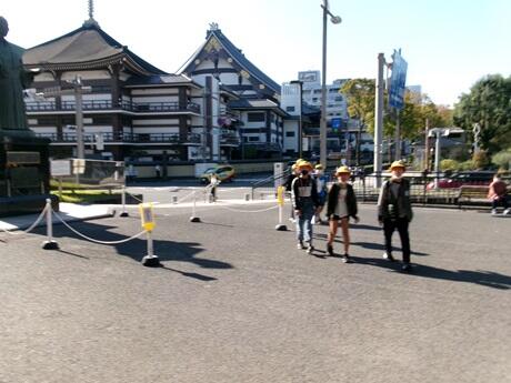 鹿児島市中央公園横の西郷隆盛の銅像前で記念写真後、グループ学習での鹿児島市内見学の旅が始まりました。