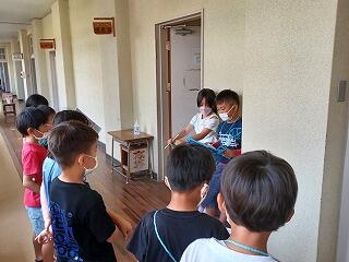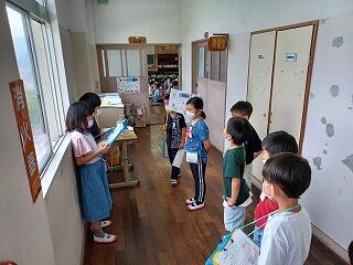 今日は、2年生が1年生をリードして、学校探検をしました。グループの旗を先頭に、校長室、職員室、事務室、音楽室、理科室などを回りました。それぞれの部屋の前には、2年生の担当が待ち構え、その部屋についての説明を上手にしていました。授業中なので、廊下の移動はしっかり無言ができていて立派でした。校長室では、歴代校長の写真を眺めて、数える姿が微笑ましかったです。2年生がとても頼もしいお兄さん、お姉さんに見えました。2年生の皆さん、ご苦労様でした。さすが2年生でした。