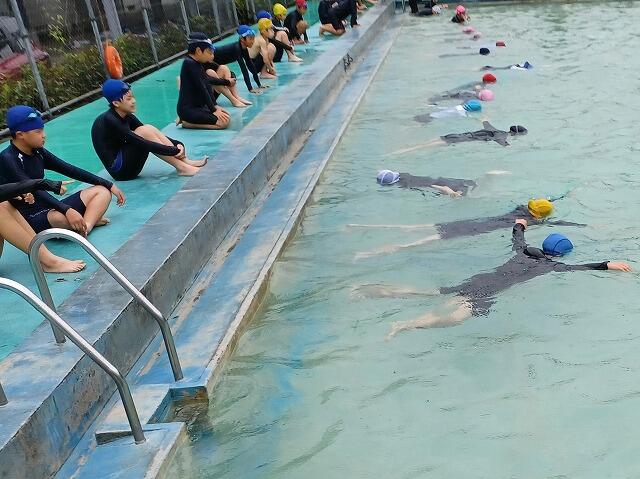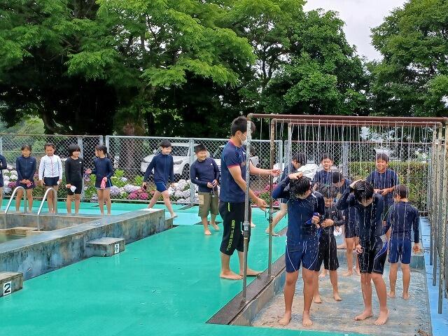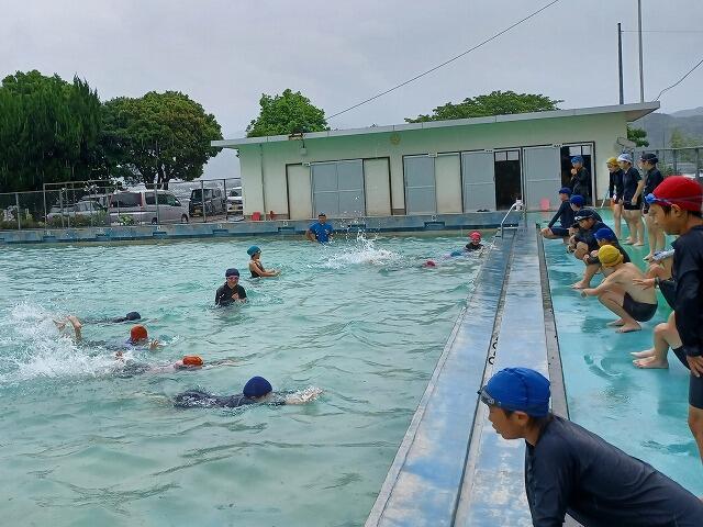 今日から水泳学習が始まりました。1・2校時、小雨が降る中、5年生が初泳ぎをしました。若干肌寒い天候でしたが、子ども達は大喜びでした。1年ぶりの水泳ですので、十分に水慣れの運動を行っていました。水泳学習もコロナ禍でいろんな制約がありますが、子ども達の泳力を伸ばせるように指導していきます。この後計画されていた3・4年生は、雨のために延期しました。次の体育の日をお楽しみに。